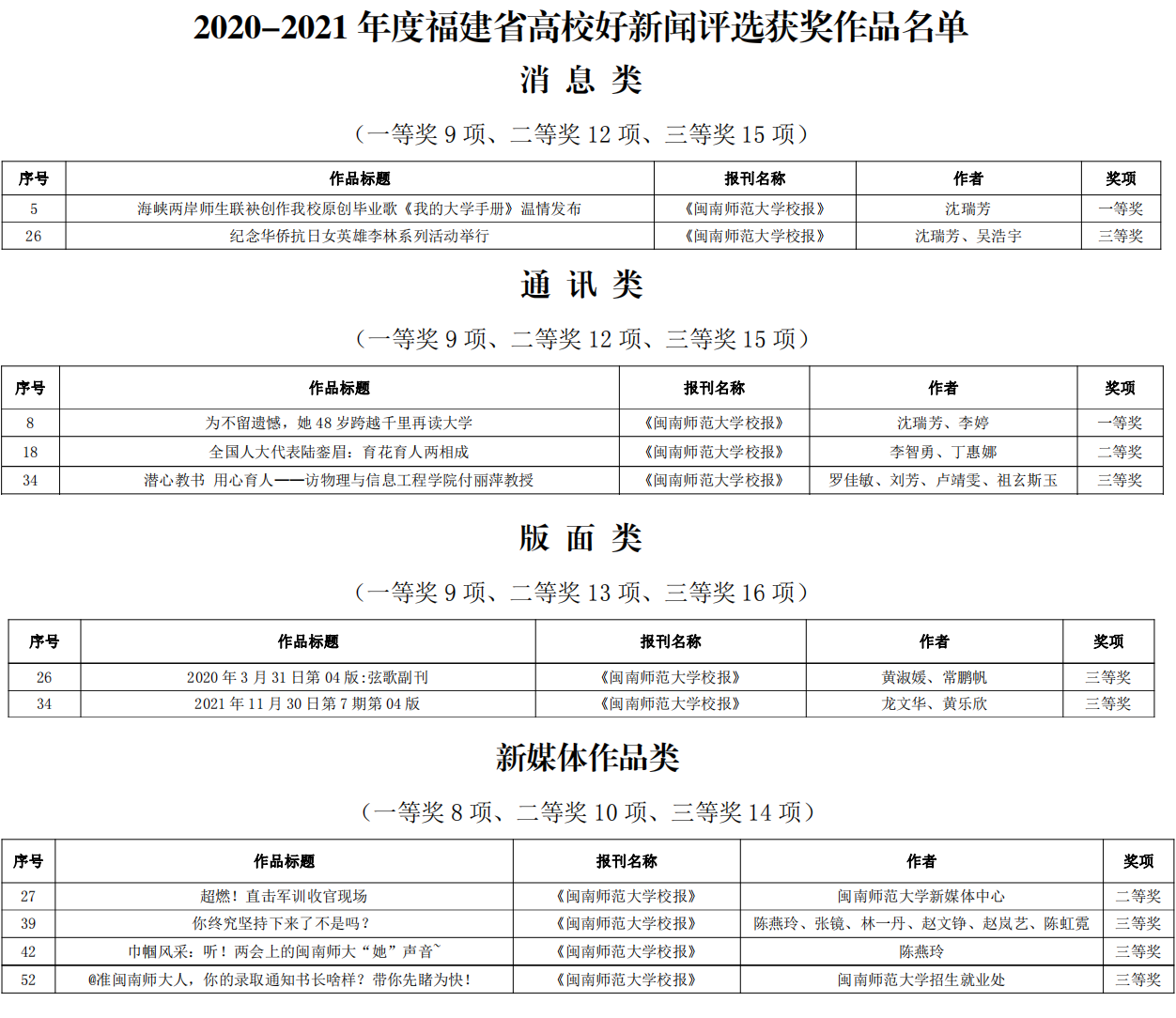 近日,福建高教学会高校新闻宣传研究会公布2020-2021年度福建省高校好新闻评选结果,best365官网登录入口共11件作品获奖。其中,《海峡两岸师生联袂创作best365官网登录入口原创毕业歌〈我的大学手册〉温情发布》获消息类一等奖,《为不留遗憾,她48岁跨越千里再读大学》获通讯类一等奖,《全国人大代表陆銮眉:育花育人两相成》获通讯类二等奖,《超燃!直击军训收官现场》获新媒体作品类二等奖。此外,best365官网登录入口报送的作品还获得消息类三等奖1项,通讯类三等奖1项,版面类三等奖2项,新媒体作品类三等奖3项。