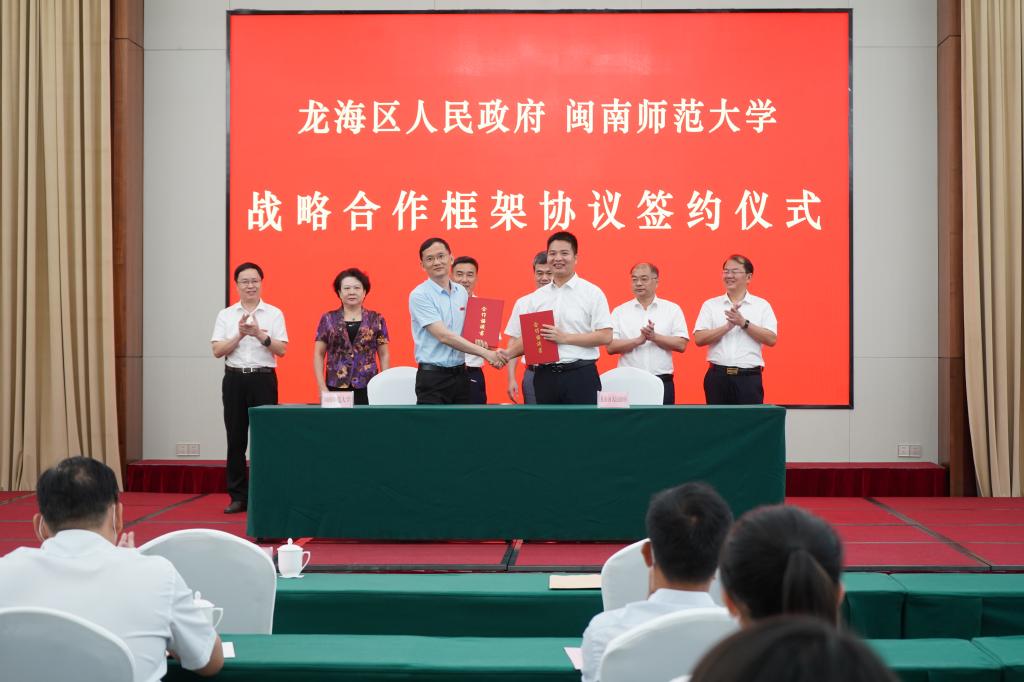 李顺兴与陈艺章代表双方共同签订战略合作框架协议。根据协议,双方将开展务实深入的合作。在人才方面,开展人才培养及培训合作、“双向挂职”等活动。在教育方面,闽南师范大学充分发挥教师教育特色优势,助推龙海区提升教育质量;建立“闽南师范大学教学实践基地”,开展闽南师范大学“乡村支教”实践活动;联合打造智慧教育示范中心、智慧教育研究中心及智慧教育校内外实践基地,推进龙海区智慧教育发展。在科技方面,通过项目建设、平台建设、智库建设、产学研合作,推进双方共赢发展。在文旅合作方面,整合资源,发挥双方优势,以政府、院校合作为龙头,带动企业、民间机构积极参与,融合发展。