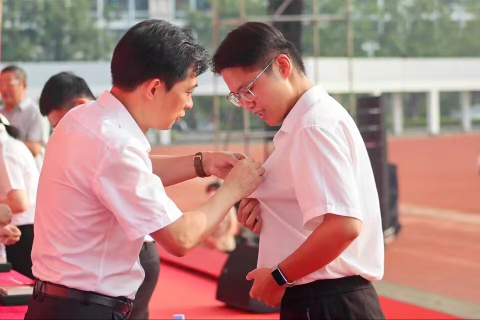 校领导为新生代表佩戴校徽