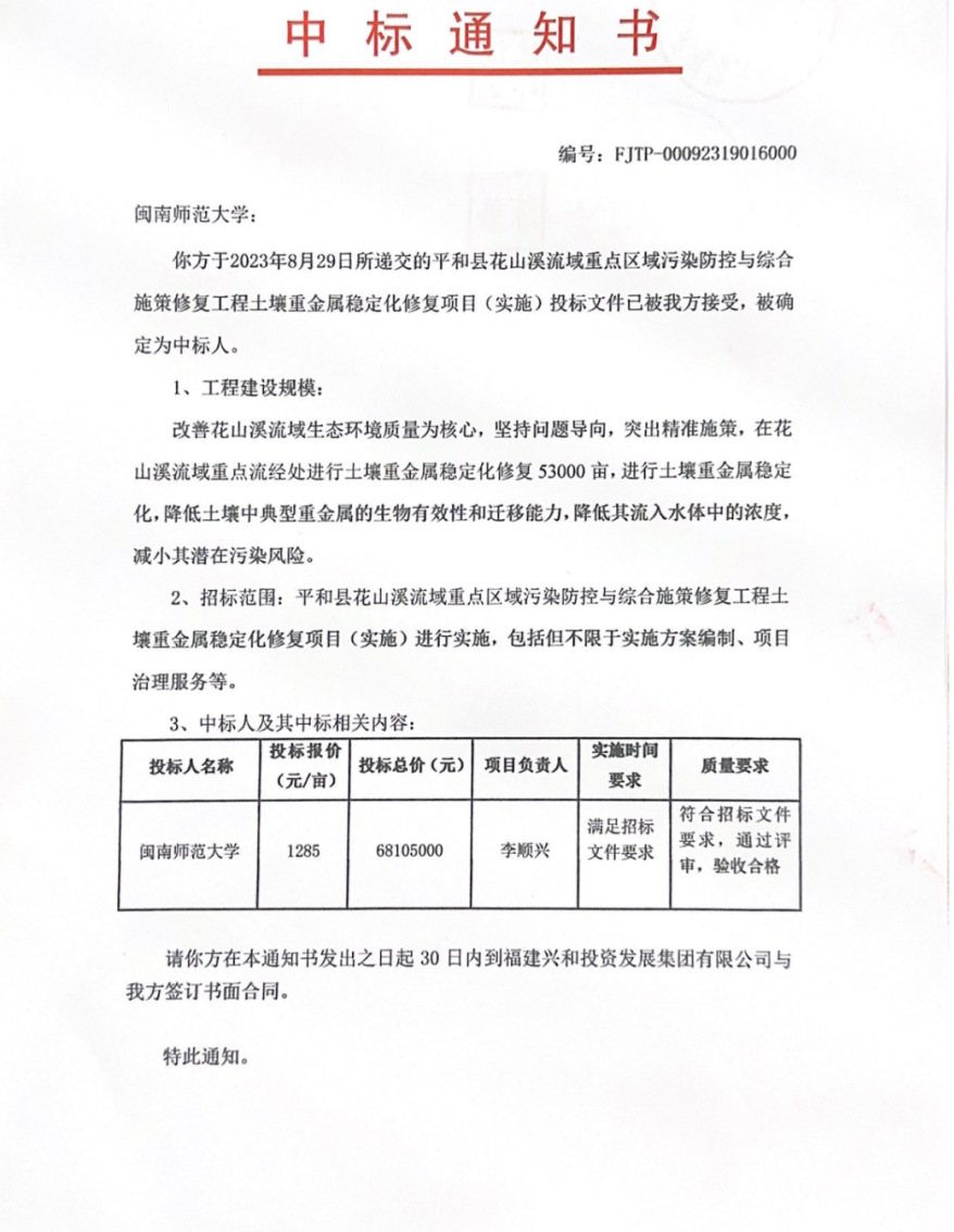 近日,best365官网登录入口李顺兴教授“环境与健康”团队中标“平和县花山溪流域重点区域污染防控与综合施策修复工程土壤重金属稳定化修复项目(实施)”,项目金额6810.5万元。同时,李顺兴教授牵头研发的“一种基于改性腐殖酸的土壤中铊稳定化技术”授权使用于平和花山溪土壤中铊污染治理,经化学化工与环境学院组织专家组评估、公开招投标,已转化成功,成交价410万元。这标志着best365官网登录入口在生态环境领域已具备较强的应用研究能力,有助于提升best365官网登录入口学科建设的贡献度和影响力。