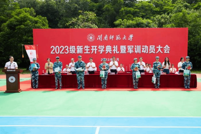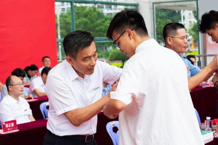 典礼上还举行了校徽佩戴仪式,校领导为两个校区的新生代表佩戴校徽,并为恰逢在开学期间过生日的新生送上礼包。吴彬镪向闽南师范大学军训团、闽南师范大学圆山营教官代表授旗。现场各营、连旗帜同步挥舞,旌旗猎猎,与迷彩蓝交相辉映。