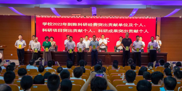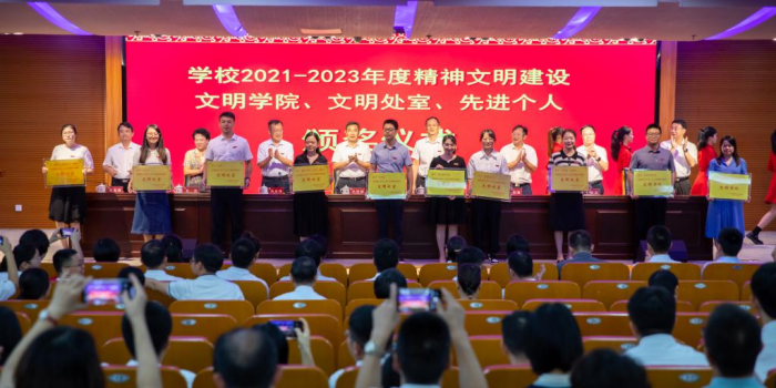 在庄严的国歌声中,大会正式开始。会上,校党委副书记肖庆伟宣读“龙江学者”特聘教授聘任决定,福建省优秀教师、优秀教育工作者表彰决定,2023年学校优秀教师、优秀教育工作者、优秀班主任、优秀研究生导师表彰决定,2021-2023年度精神文明建设文明学院、文明处室、先进个人表彰决定以及2020-2022年宣传工作先进单位、先进个人、优秀宣传平台表彰决定。校党委常委、副校长张龙海宣读2022-2023学年教学业绩突出个人的表彰决定,以及在科研方面作出突出贡献集体和个人的表彰决定。全体校领导为获得表彰的单位和个人颁发荣誉证书、奖牌和奖杯。校党委书记吴彬镪向在科技创新成效显著、科研取得重大突破的两个科研团队代表李顺兴教授和张艳辉教授献花。