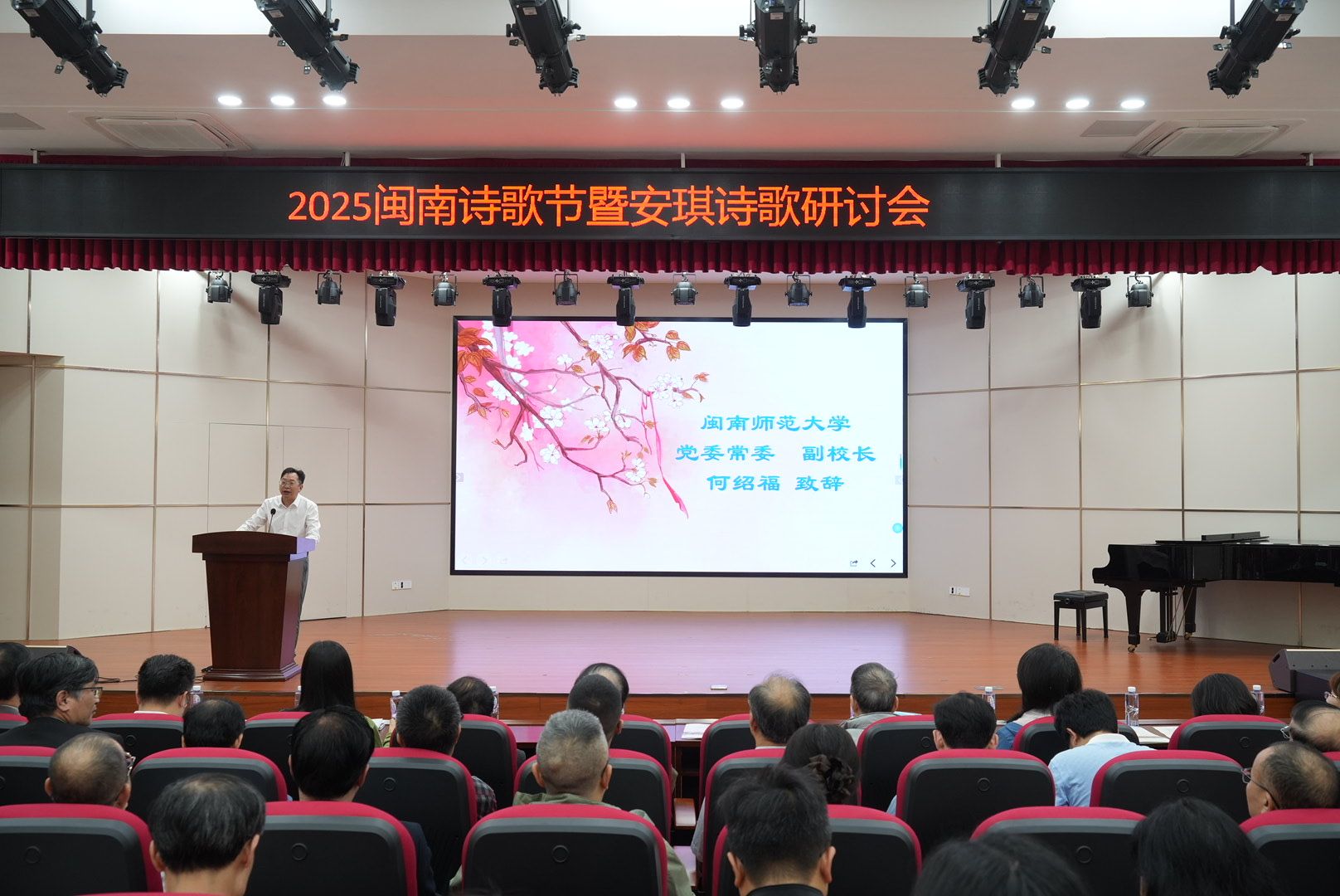 校党委常委、副校长何绍福在开幕式上致辞。他表示,闽南师范大学闽南诗歌节至今已经举办十届,现已成为闽南地区文学文化交流的重要平台和品牌活动,希望与会嘉宾以诗为媒,深入交流探讨闽南文化,让诗韵连接两岸,加深对中华优秀传统文化的理解和认同,增强文化自信。