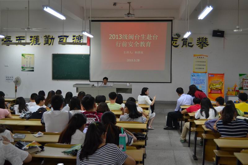 为使best365官网登录入口闽台生更好地在台湾各高校交流和学习,5月28日下午,学生处联合校台办在笃行楼126教室举行2013级闽台生赴台行前安全教育。此次会议邀请到漳州市台办杨清泉科长担任主讲。杨科长首先介绍了台湾地区的风土人情,随后分别从不同角度对同学们提出了希望与要求。一、要求同学们保持坚定的政治立场,坚持一个中国原则,注重自身言行。二、要求同学们遵守台湾地区法律、法规,及双方的校规校纪,不参加任何政治团体与宗教活动。三、要求同学们认真刻苦学习,发扬团队合作精神,互帮互助,克服困难,圆满完成学业。