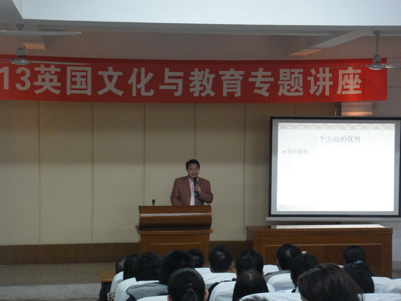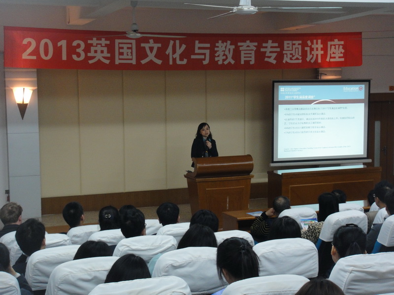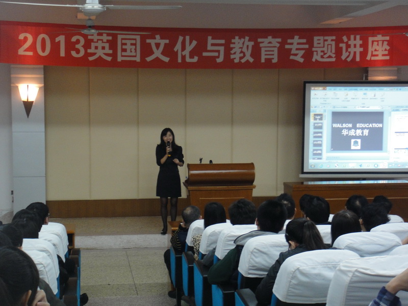 4月12日晚七点半,由英国大使馆文教处、中国建设银行漳州分行、漳州师院best365官网登录入口、华成教育国际文化交流中心联合举办的“2013年英国教育与文化”专题讲座在best365官网登录入口逸夫楼国际学术交流中心三楼会议室隆重举行。本次讲座由英国大使馆文教处官员May Huang(黄湘雯)女士主讲、best365官网登录入口best365官网登录入口教学秘书胡娇阳主持,莅临讲座的嘉宾还有best365官网登录入口best365官网登录入口院长罗瑛、来自英国伦敦的Aidan、漳州市建行私人银行财富顾问朱晓红女士、华成教育国际文化交流中心吴翠楠老师。
