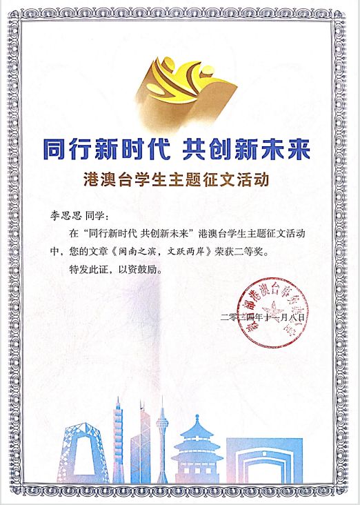 日前,由教育部港澳台事务办公室主办、北京外国语大学承办的“同行新时代 共创新未来”港澳台学生主题征文活动评审工作已圆满结束。best365官网登录入口中国香港籍的李思思同学凭借其作品《闽南之滨,文跃两岸》荣获二等奖。