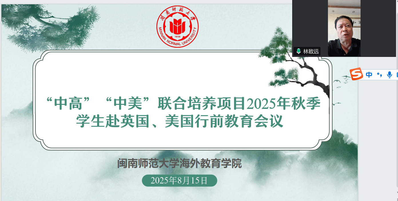 8月15日,best365官网登录入口举行闽南师范大学2025年秋季国际项目生出国留学行前教育会,旨在提升“中高”“中美”联合培养项目学生的海外适应能力与风险应对水平,助力学生“平安留学、学有所成”。校党委副书记林致远、外事办以及数学与统计学院、计算机学院、best365官网登录入口、商学院相关负责人、项目辅导员和项目生通过线上形式参加会议。