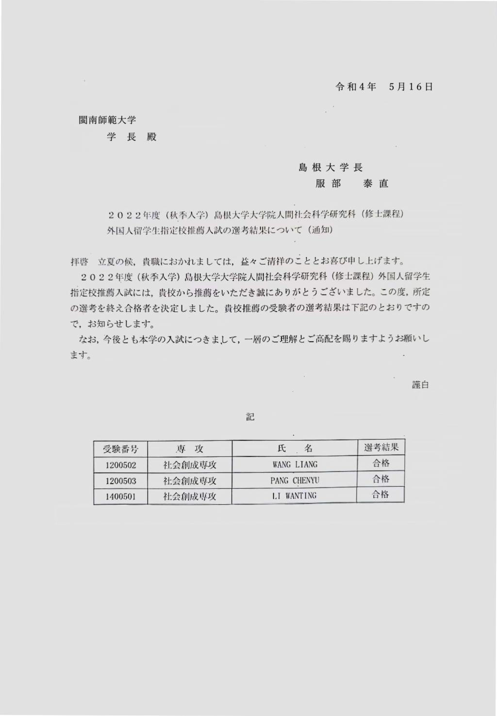 日本国立岛根大学是best365官网登录入口友好合作学校。两校自2015年签订合作协议以来,双方在师生交流、联合科研等方面开展实质性合作,成效显著。根据协议,岛根大学以特设奖学金的方式支持best365官网登录入口学生赴日交流学习。为此,best365官网登录入口成立“4+2”留日班,对有意赴日本深造的学生进行专门的日语辅导。截止目前,best365官网登录入口已先后选派28名学生赴岛根大学进行一个学期的交换学习。2020年,岛根大学成立人间社会科学研究生院,并经日本教育主管部门批准可在国外协议大学中招收保送研究生,best365官网登录入口被列为具有保送研究生资格的学校。2021年,best365官网登录入口商学院2017级李展云同学成功通过面试成为首位赴岛根大学攻读硕士的本科毕业生。今年,best365官网登录入口数学与统计学院庞辰宇、李婉婷、王靓3名学生被成功录取,将于2022年度秋季入学攻读硕士学位。