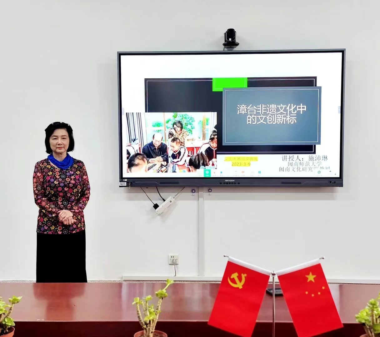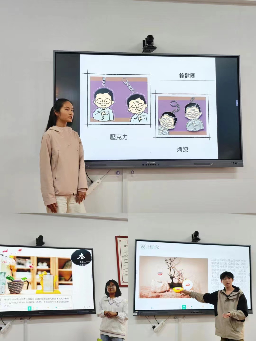 活动伊始,来自闽南文化研究院的台湾教师、福建省首批引进台湾高层次人才“百人计划”入选人施沛琳教授开设题为《漳台非遗文化中的文创新标》的讲座。施沛琳教授从漳台两地的非遗文化与文创设计角度,分享了丰富而真实的漳台田野调研案例,阐释如何对文化历史遗产进行理解与解读,从而汲取物质和精神方面的文化元素,并结合时代特点、社会审美等因素设计出中国式现代化新标的文创产品。讲座中,施教授分享的大量文创作品,给我们带来了一场视觉盛宴,并激发了在座同学们的文创热情。